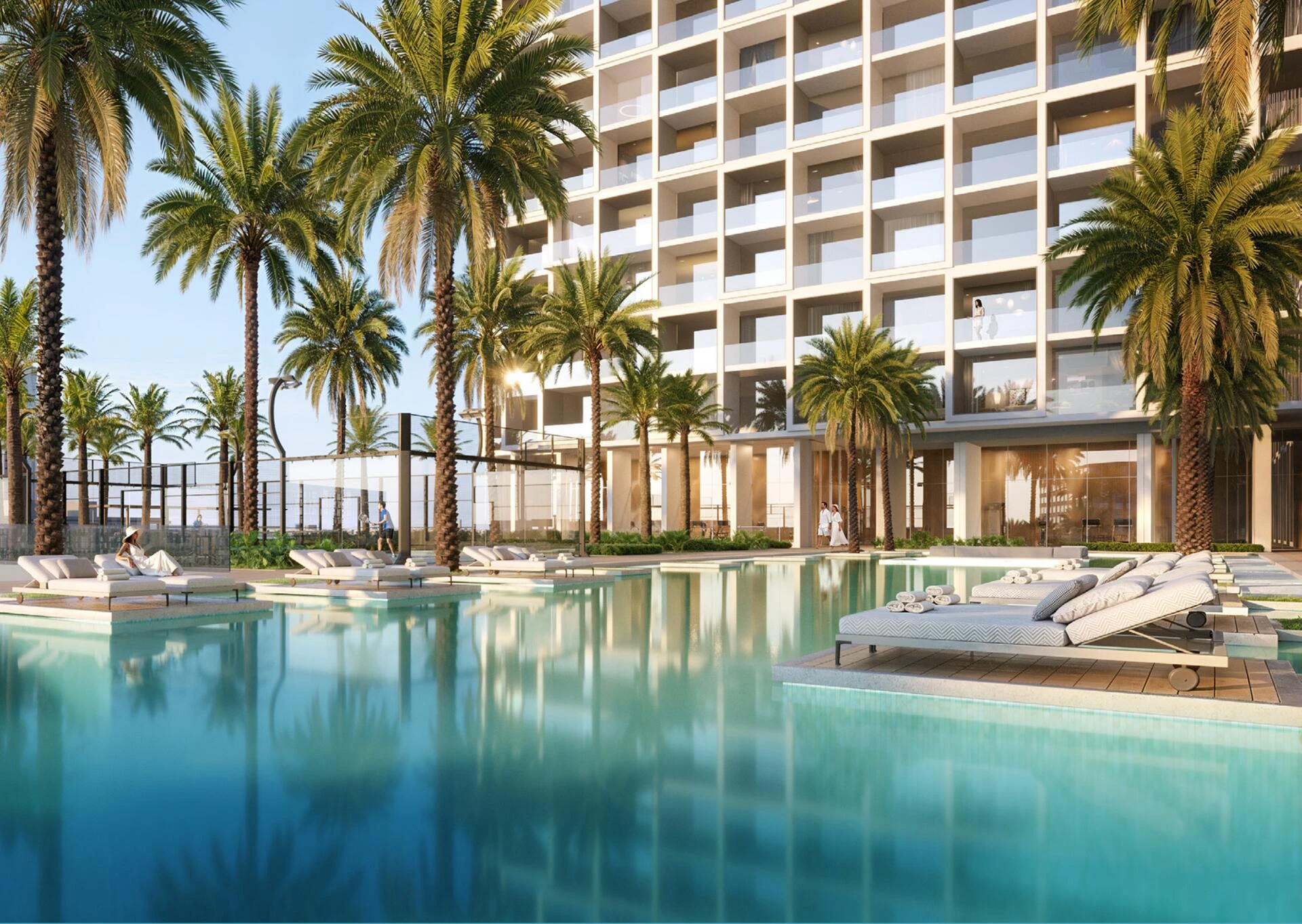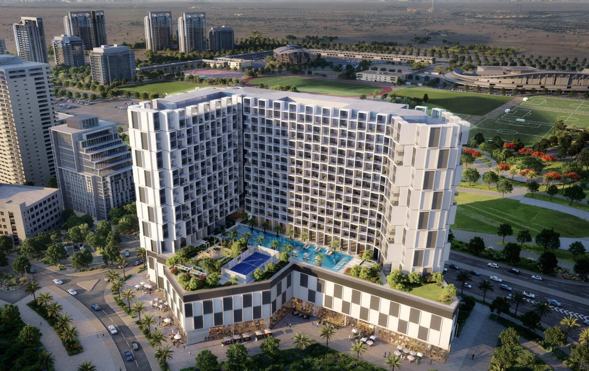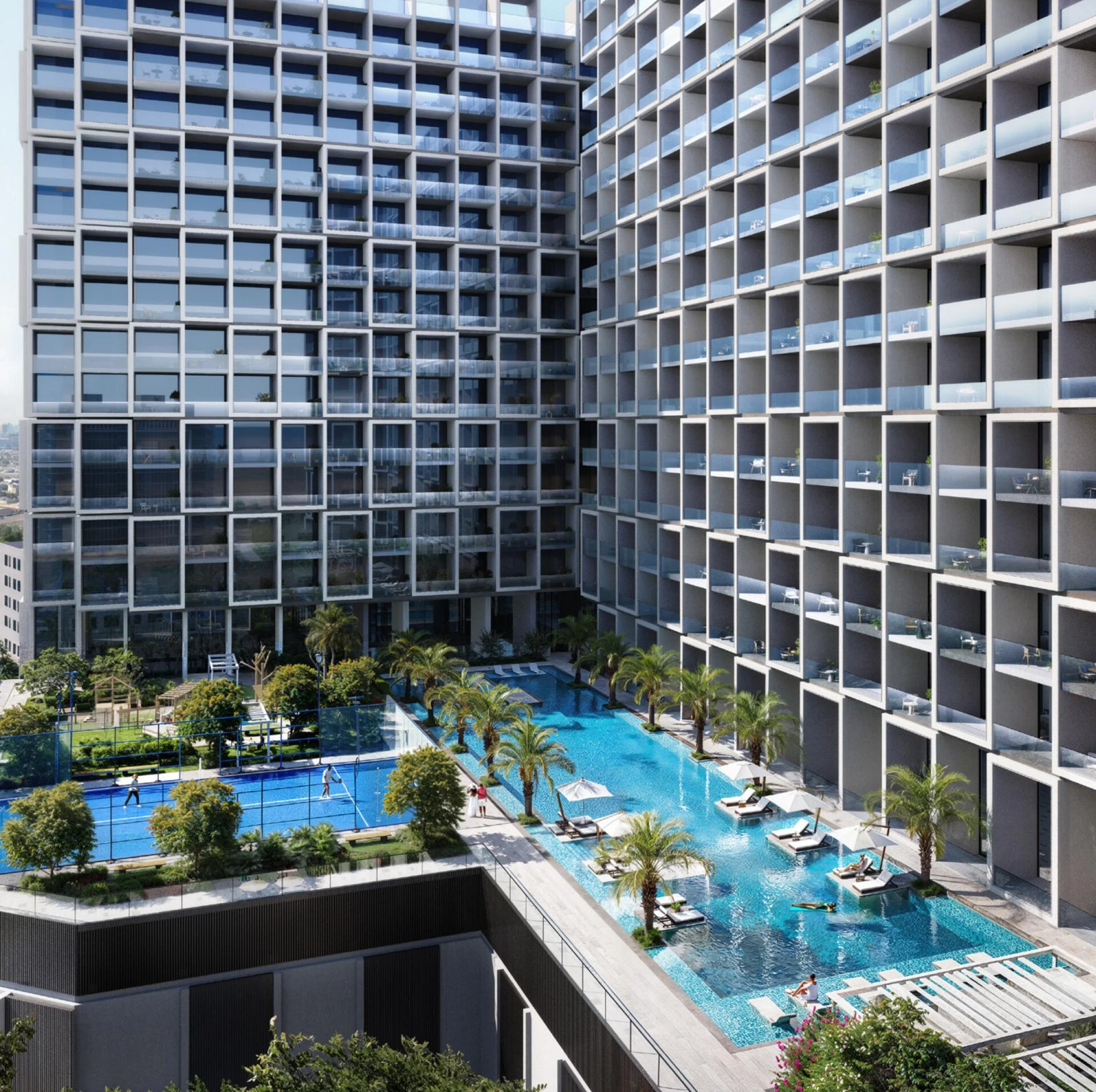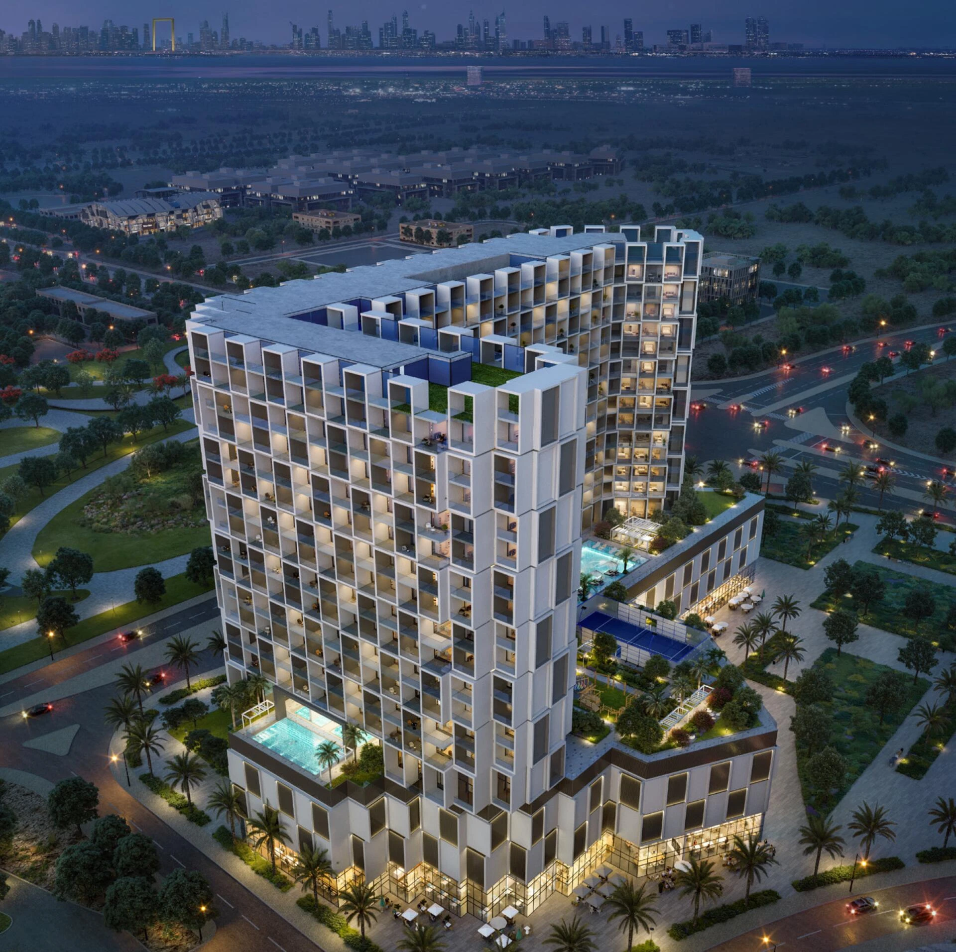 The amenities are curated for every lifestyle: unwind at the adult swimming pool, let the little ones enjoy the specialized children’s pool and play areas, or stay active with top-tier facilities including a gym, padel court, and mini golf. Every detail is designed to create an elevated community atmosphere within the heart of Dubai.