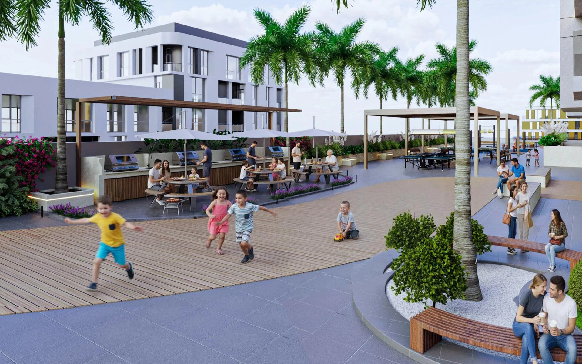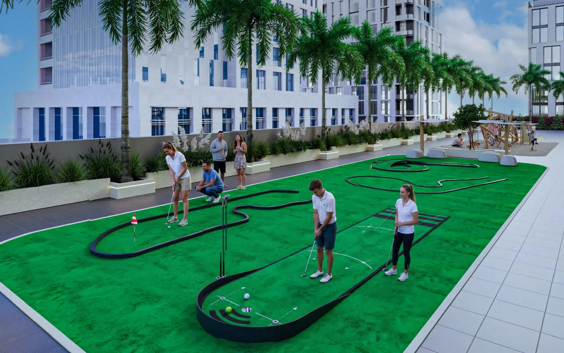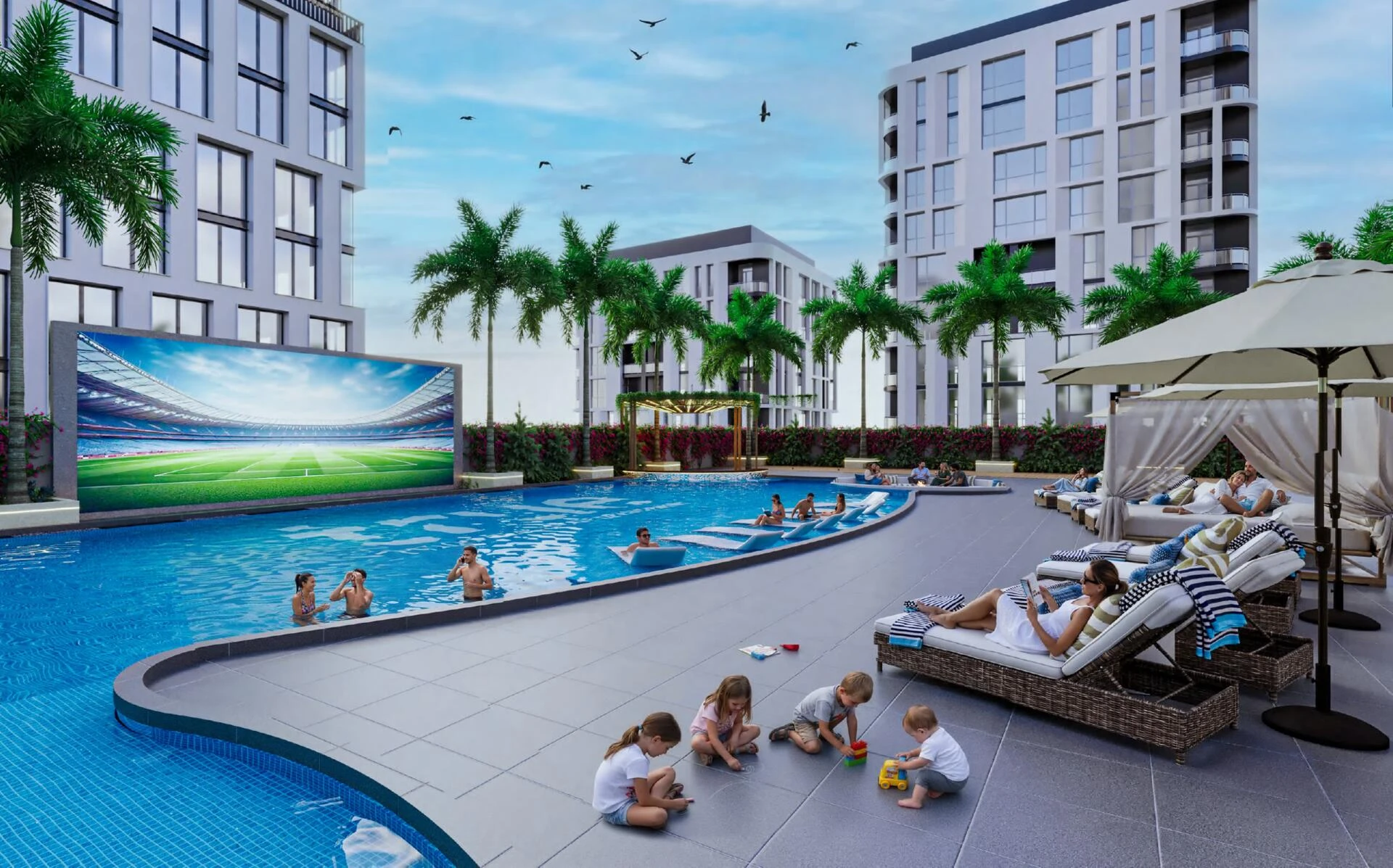 Residents enjoy exclusive access to an array of amenities designed for relaxation, wellness, and entertainment. Dive into indoor or outdoor pools, unwind at the yoga retreat, or enjoy evenings by the outdoor fireplace or pool bar. Families are catered for with dedicated play zones and mini golf, while fitness enthusiasts will appreciate fully equipped gyms and an outdoor workout area. Community perks also include barbeque spaces, an outdoor cinema, games zones, and scenic walking paths bordering picturesque lagoons.